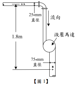 四、10℃的水,以 120 L/min 的速率流經【圖 1】的液壓馬達。在 A 處的壓力為 700 kPa,在 B 處的壓力為 210 kPa。假設所有能量損失忽略不計,重力加速度 g = 9.8 m/s