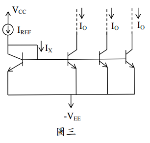 三、圖三電流鏡電路中所有電晶體特性均相同,均具有β = 80,忽略電晶體之輸出電阻, 已知 I