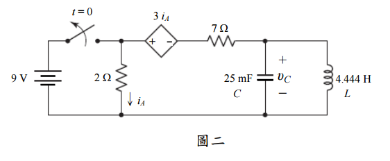 二、如圖二所示電路中的開關在 t=0 前已經關閉了一段時間。試求: (每小題 5 分,共 20 分)