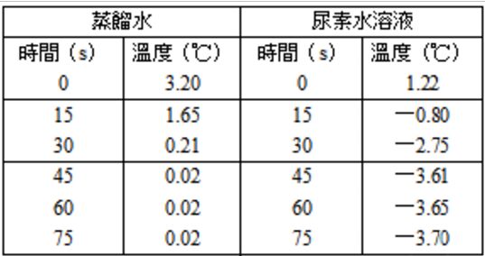 4.蒸餾水及尿素水溶液(6.0克的尿素溶於50.0克的水中)冷卻時,其溫度隨時間的變化情形如下表所列,已知水的凝固點下降常數為1.86℃/m。