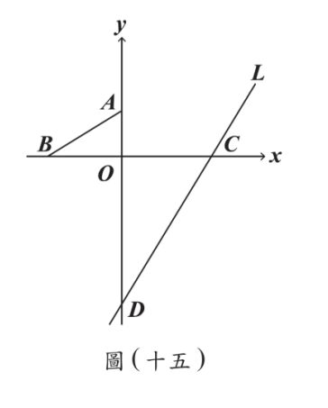 2. 如圖 ( 十五 ),在坐標平面上,O 為原點,另有 A(0,3)、B(−5,0)、C(6,0) 三點,直線 L 通過 C 點且與 y 軸相交於 D 點。 請回答下列問題: