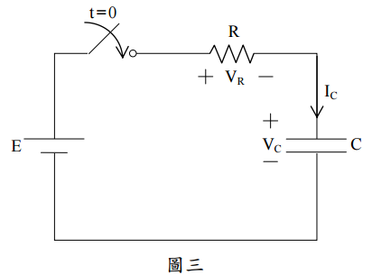 ,t < 0 開關為開路且電容元件 之電壓初值為零,當 t = 0 時開關閉合:
