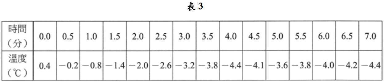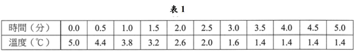 步驟 1:以量筒量取 50.0 毫升的蒸餾水,置入小燒杯內,將小燒杯直接放到已先調製好的冷 劑(碎冰和食鹽的比例約為 3: 1) 中,一手持溫度計,另一手持玻棒不停攪拌,每 30 秒 記錄一次溫度,實驗結果如表 1(純水凝固點的測定紀錄)。