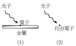 (1) 頻率為 f 之入射光的一光子與在金屬表面的一電子發生光電效應,如圖(1)。電子逸出金屬表面的最大動能 Kmax 應與頻率 f 呈線性關係。