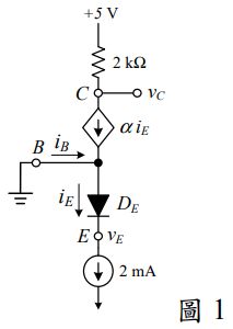 一、圖 1 為 npn 電晶體的模型加上電阻 2 kΩ,電流源 2 mA 及電壓源+5 V,若電晶體的共射極電流放大倍數 β = 100 及逆向飽和電流 Is = 5×10-15 A,熱電壓 VT = 0.025 V,試求: