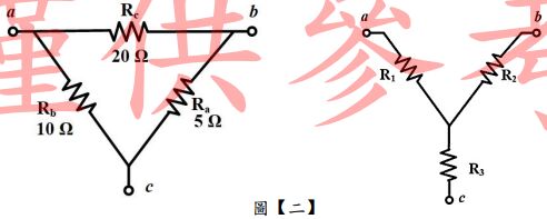二、如圖【二】所示的 Δ 網路轉換成等效的 Y 網路,試求出:
