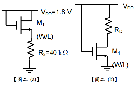 (2)【圖二 (b)】為另ㄧ種電流設計方法,假如所需電流為 100µA,電路必須使電晶體工作在飽和區,求最大之電阻 RD及最小之電壓 V