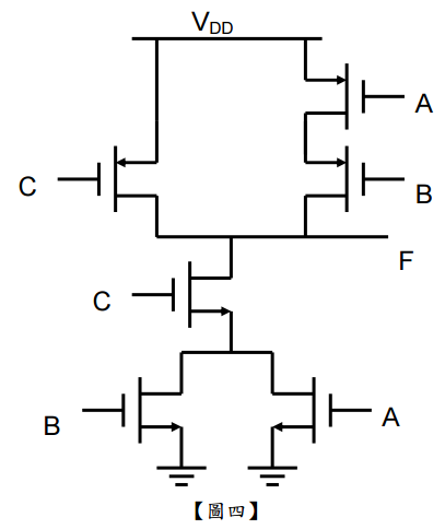 (2)利用傳統 CMOS 電路實現邏輯布林函數 F = (A⊕ B) ,可以使用反相器產生輸入信號 A,B, C 之反相信號。除輸入信號反相器外,此電路為一級之邏輯電路(one-stage logic gate),即僅允許一個輸出點 F。【15 分】