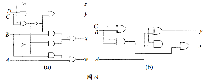 (2)圖四(b)以 A、B、C 為輸入,x 及 y 為 輸出的布林函數。(10 分)