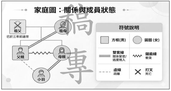 高一學生小羽,近半年出現頻繁拒學,伴隨社交退縮與情緒低落。下圖為輔導教師收集資料後繪製的家庭圖: