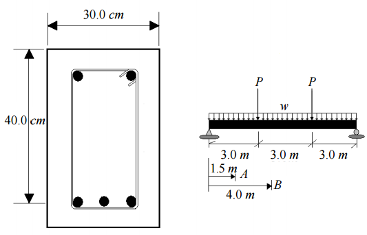 ,距左端 1/3 跨度處及距右端 1/3 跨度處各自承受集 中活載重P=10,000.0 kgf,此外亦承受均佈靜載重(包含梁自重)w=30.0 kgf/cm, Vc=0.53 '