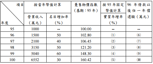 四、某公司最近幾年營業淨收入如下表,雖然每年營收皆增加,但應考慮物價變動因素, 試問表格內(1)~(5)每年實質增加率為何?又該公司在 96 年向私人借 300 萬元,依照 歷年物價上漲幅度,表格內(6)~(10)以後任何一年償還借款該償還多少?(每小格 2 分, 共 20 分)