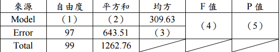 ⑵下表為某研究所獲得複迴歸(Multiple Regression)的 SAS 輸出結果,請將空格 從(1)至(5)依序於試卷上寫出答案。(10 分)