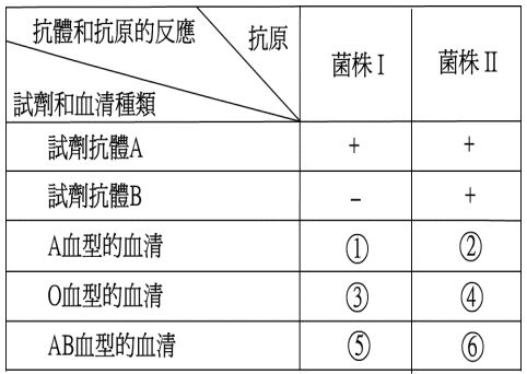 1. 李生使用鑑定人類ABO血型的兩種抗體試劑(抗體A和抗體B)和來自不同 血型人的血清,分別與兩株人類腸道菌 I和II進行抗體與抗原反應的測定。 實驗結果記錄在下表,其中以「+」表示抗原與抗體有反應, 「-」則表示沒有反應。根據下表結果回答下列問題。