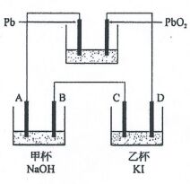 38. 下圖是以鉛蓄電池電解 NaOH(aq) 及 KI(aq), A、B、C、D均為鉑電極,甲為 10g、10%之NaOH(aq),乙為2升1M之KI(aq)。在 25°C latm通電32分10秒,若電流 為10A,則: