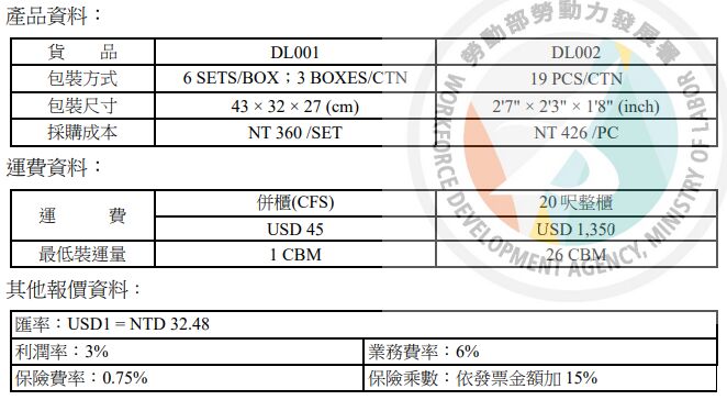 根據以下資料,對貨號 DL001 與貨號 DL002 兩種以體積噸計算海運運費的貨物, 分別以併櫃與整櫃運量,核算相關運費與報價。