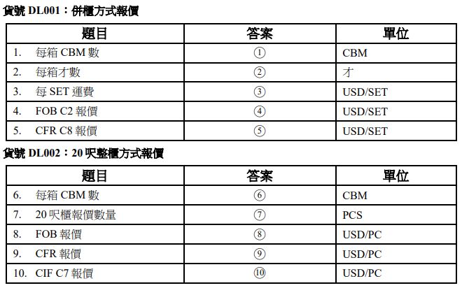 注意事項:1. 請直接填入數字答案,計算過程不得列出。2. 核算要求:CBM 計算至小數點第 4 位,四捨五入後取 3 位;其餘請計算至小數點第 3位,四捨五入後取 2 位。3. 含佣價計算方式:以所求報價條件本身為佣金計算基礎,如 FOBC、CFRC 與 CIFC 分別為 FOB、CFR 與 CIF 基礎之價格
