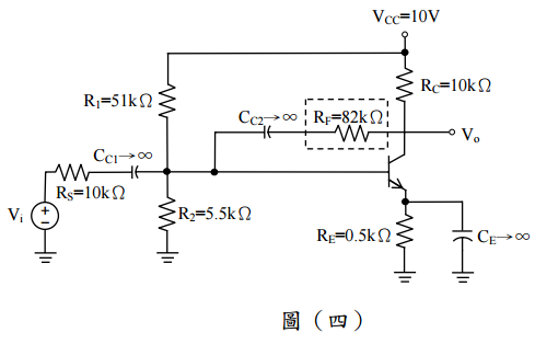 四、圖(四)所示為一回授放大器電路,電晶體參數為h