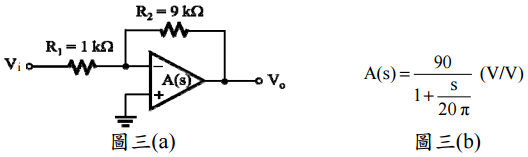 三、圖三(a)運算放大器開路增益 A(s)如圖三(b),s=jω,其他特性均為理想。下列計算可 利用之近似:log