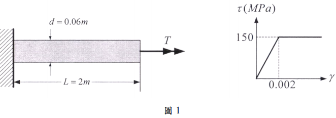 一、長 L=2 m,半徑 R=0.03 m 之實心圓桿受到扭矩 T 作用,如圖 1 所示。此實心圓桿 為理想塑性材料(perfect plasticity),求: