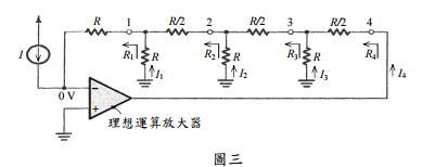 三、圖三表示一個理想運算放大器,外加一個電流源 I,流進輸入端。廻授採用電阻網 路。在節點 1, 2, 3, 4 上,試求: