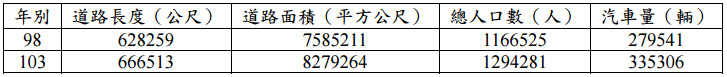 四、下表為某城市 98 年及 103 年之道路、人口及汽車資料:
