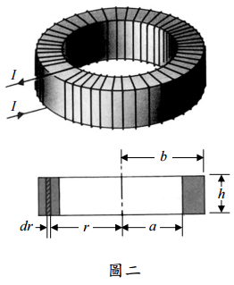 二、圖二為細線所繞成之螺線環形線圈,內半徑為a ,外半徑為b,中空部分之截面為 長方形,高度為h,設線圈之圈數為N ,