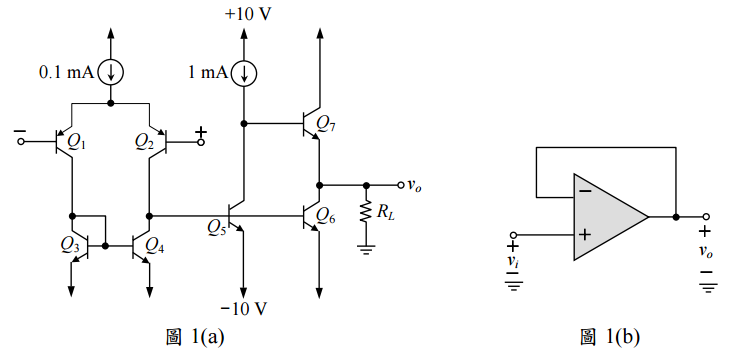 一、若將圖 1(a) 所示之運算放大器,依照圖 1(b) 所示連接為電壓隨耦器,結果該電 路發生震盪現象,