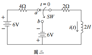 二、如圖二所示之電路,開關 SW 閉合於位置 已經一段很長的時間。在時間 t=0 時, 開關 SW 由位置a 切換至位置b 。