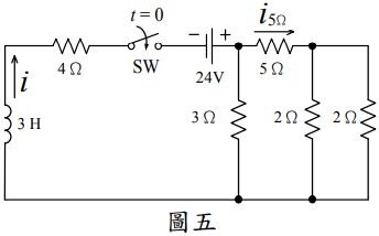 ⑴開關電路如圖五所示,將開關 SW 於 t = 0 時關上,並假設 3 H 的電感無初始電流, 試求 i(t),t ≥ 0。 (15 分)