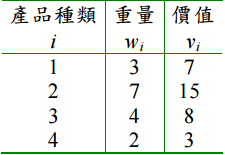 二、假設一輛貨車將裝載四種不同的產品。這四種產品每一箱的重量(單位噸)及價值 (萬元)如下表所示: