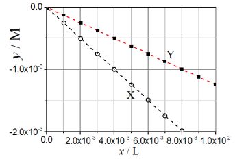 ⑵以相同方式溶解 25.00 克的另一化合物 Y 時,其濃度變化量(y)與 x 呈現出如曲 線 Y 所示的關係。估計 Y 的克分子量(單位:克),並詳述計算過程。(10 分)