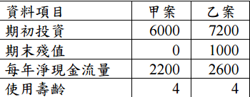 三、甲乙兩個機器設備購置案,相關資料如下(單位為萬元):
