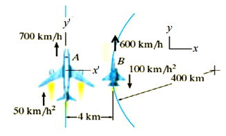 四、如圖所示,飛機 A 在一直線路徑上飛行,飛機 B 則在一圓形軌跡的路徑上飛行,其 曲率半徑為 400 km。兩架飛機相距 4 公里,其各自的瞬時速度與加速度都已經標示 在圖上。試問: