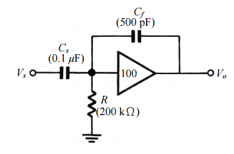 四、右圖所示電路中,在放大器之輸入 端和輸出端間若接上一個 500 pF 電 容,試問: