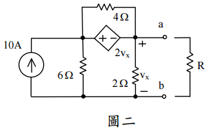 ⑵將電阻 R 接於 a 與 b 端點,若要將最大功率傳送至電阻 R,請問電阻值 R 應設計 為多少?(5 分)