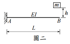 二、圖二懸臂梁 AB,其 EI 值為常數,有一點質量(point mass)m 從 B 點上方 h 高度處 輕輕放開並落在 B 點,不考慮懸臂梁 AB 的質量,試求: