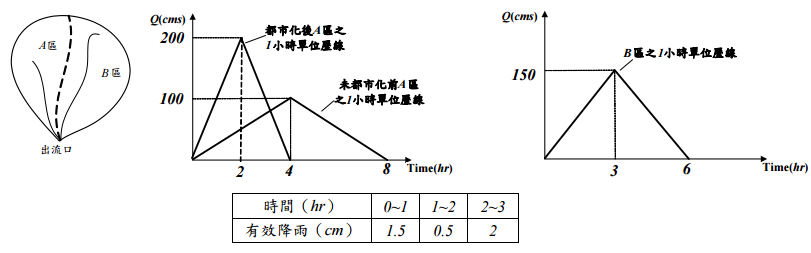 二、某一集水區由 A 區與 B 區所組成,後來 A 區都市化,A 區與 B 區各自之 1 小時單位歷 線如下圖所示。今有一場暴雨降於整個集水區,其有效降雨資料如下表所示,試求: