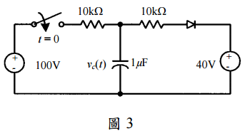三、如圖 3 所示,在 t = 0 時將開關關閉。若二極體為理想且 v