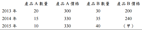 ⑵若已知 2014 年~2015 年之物價上漲率為-10%(負 10%),求甲(產品 B 於 2015 年 之價格)。(8 分)