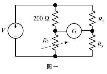 一、如圖一所示之惠斯登電橋電路,圖中 Rx為待測電阻器,R2為可調電阻器(最大值為 100 Ω),R1為固定電阻器。(每小題 10 分,共 20 分)