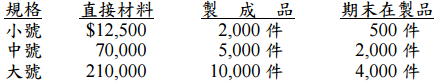 ⑵計算三種不同規格 T 恤之單位成本。(3 分)