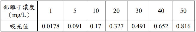 四、某實驗室中進行二批事業廢棄物中重金屬鉛的檢驗分析,廢棄物經酸消化萃取後, 以原子吸收光譜儀進行分析,得到吸光值為 0.455 及 0.016,此分析結果同時併同檢量線品保數據(如下表),交由甲、乙兩人進行鉛離子濃度的計算。兩人對檢量線數據進行迴歸處理後,甲得到的檢量線為 Y = 0.0162X+0.0058,乙得到的檢量線為 Y = 0.0163X,其中 Y 為吸光值,X 為鉛離子濃度(mg/L)。 鉛離子濃度 (mg/L)。