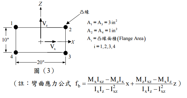 三、假設一機翼結構截面如圖(3)承受側向力Vx=4,000 lb,Vz=10,000 lb。