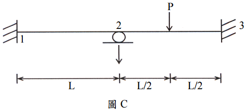 四、圖 C 的梁受外力 P=36 kN,節點 2 並下陷 0.15 cm。限以直接勁度法(Direct Stiffness Method)求: