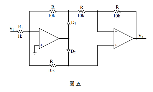 五、如圖五所示為一由理想運算放大器及理想二極體所組成之電路,