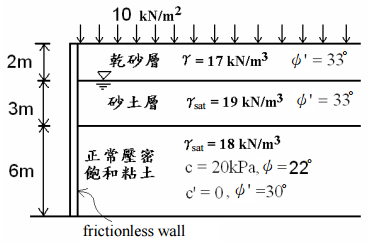 一、求下列情況下,擋土牆所受之總側向應力隨深度之變化圖:(20 分)