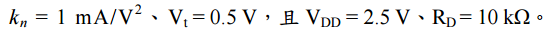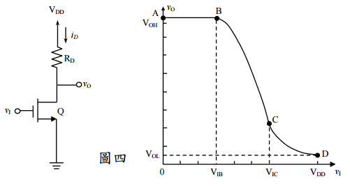四、如圖四所示為一邏輯反相器(logic inverter)電路及其電壓轉換特性(VTC)。B 點 為 MOS 電晶體工作在截止(cut-off)區與飽和(saturation)區的交界點,C 點為飽 和區與三極管(triode)區的交界點。電晶體在飽和區及三極管區之 i