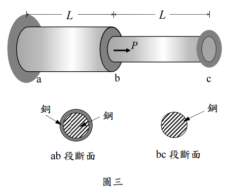 =100 GPa )緊 密結合,如圖三所示,其 a、c 兩端為固定端, L =100 cm 。設 b 點承受軸力 P =10kN 。同時,系統溫度上升ΔT = 200℃。假設鋼棒與銅管的熱膨脹係數分別為 α s =14×10