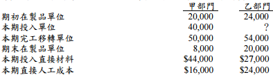 二、大昌公司產品由甲、乙部門生產製造,甲部門直接材料於開始時一次投入生產,